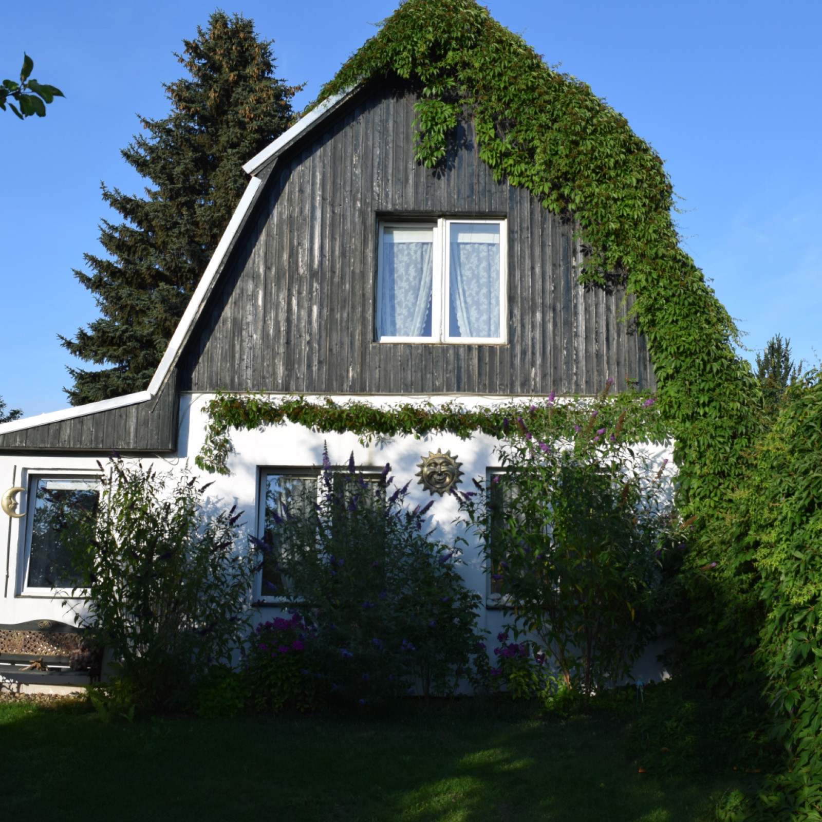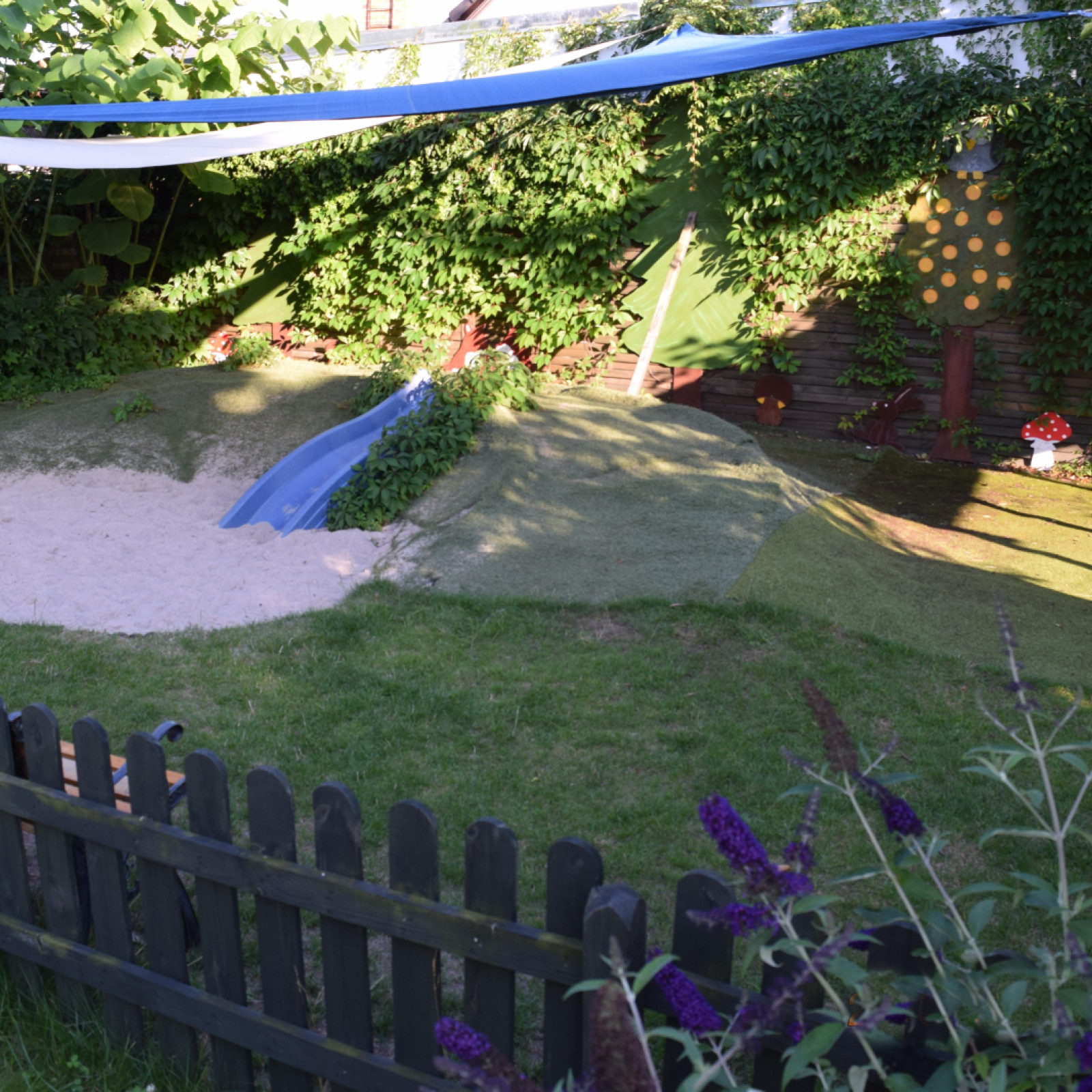 Unser großer Garten ist ein naturnaher Erlebnisraum. Sandkasten, Spielhügel, Bewegungsgeräte, Naturmaterialien und eine überdachte Terrasse laden zum Spielen, Forschen und Erleben ein – bei jedem Wetter.