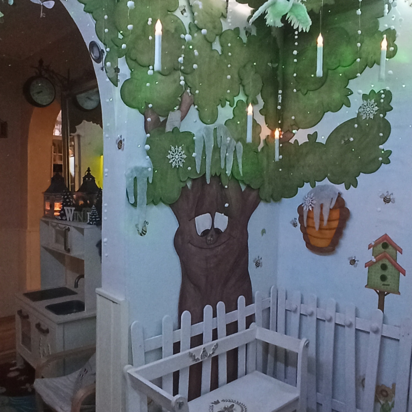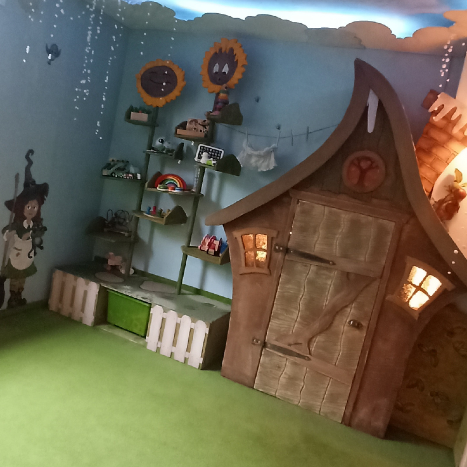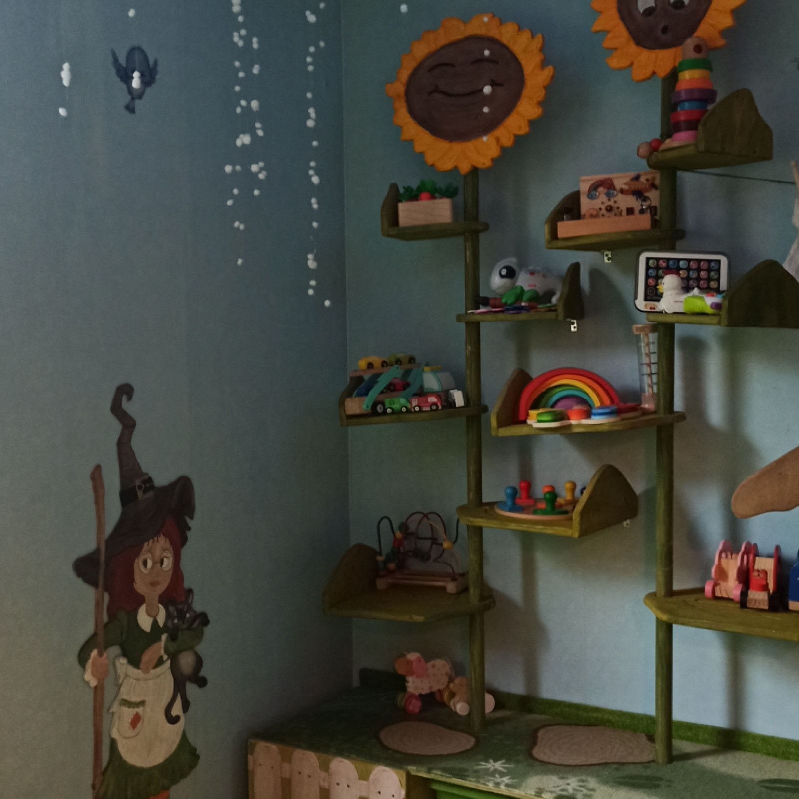 Das fantasievoll eingerichtete Spielzimmer bietet den Kindern vielfältige Möglichkeiten zum Entdecken, Bewegen und Zurückziehen. Ausgestattet ist es mit altersgerechtem Spielmaterial, einer Klettertreppe, einem Motorikbaum und einer gemütlichen Kuschelecke.