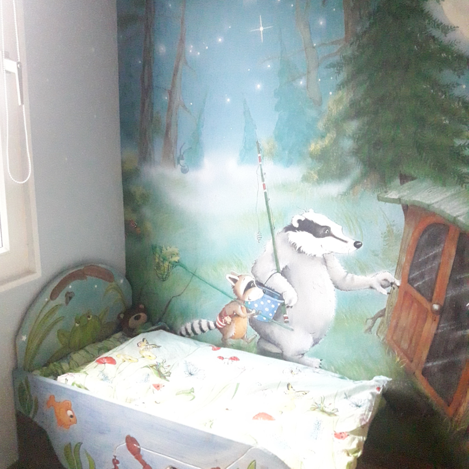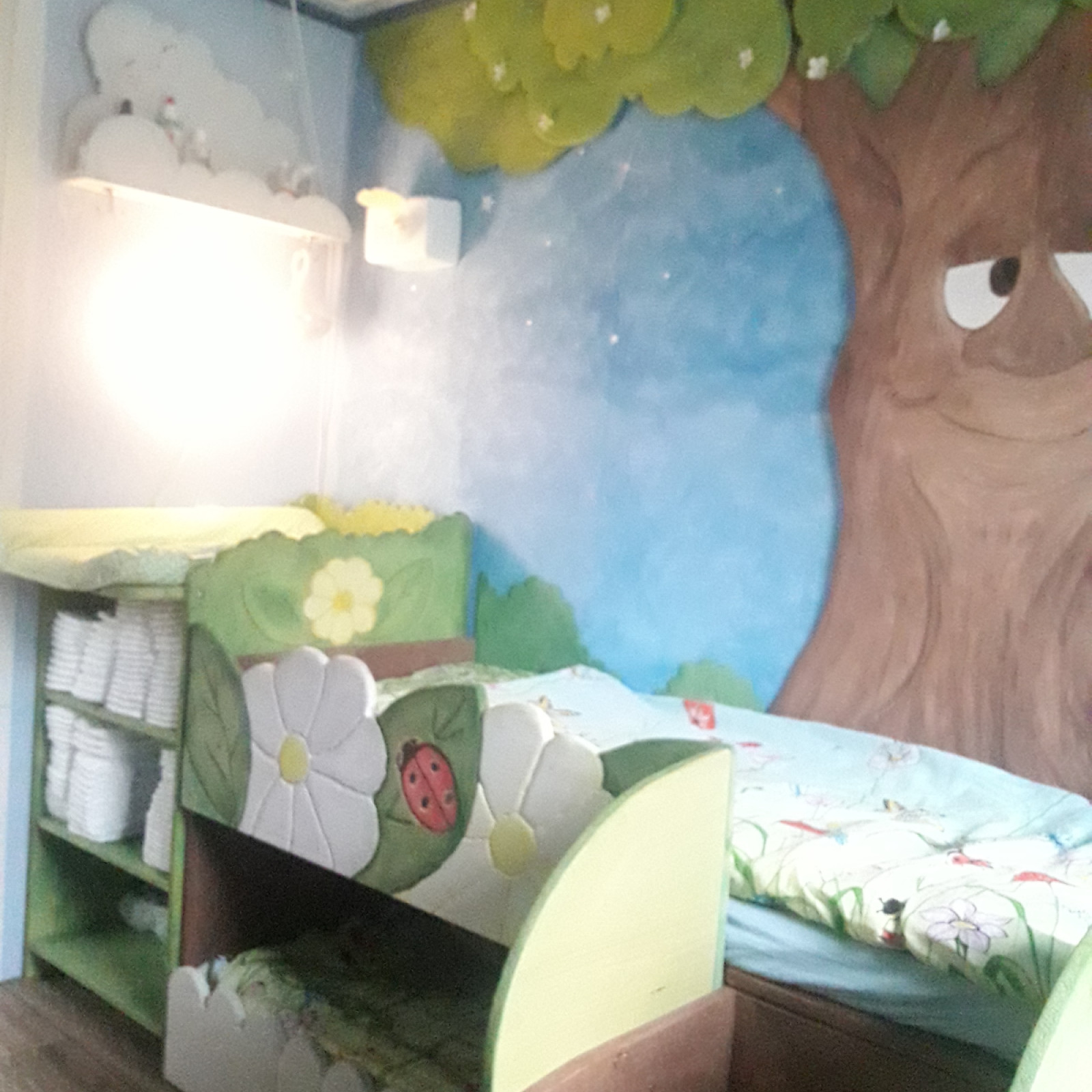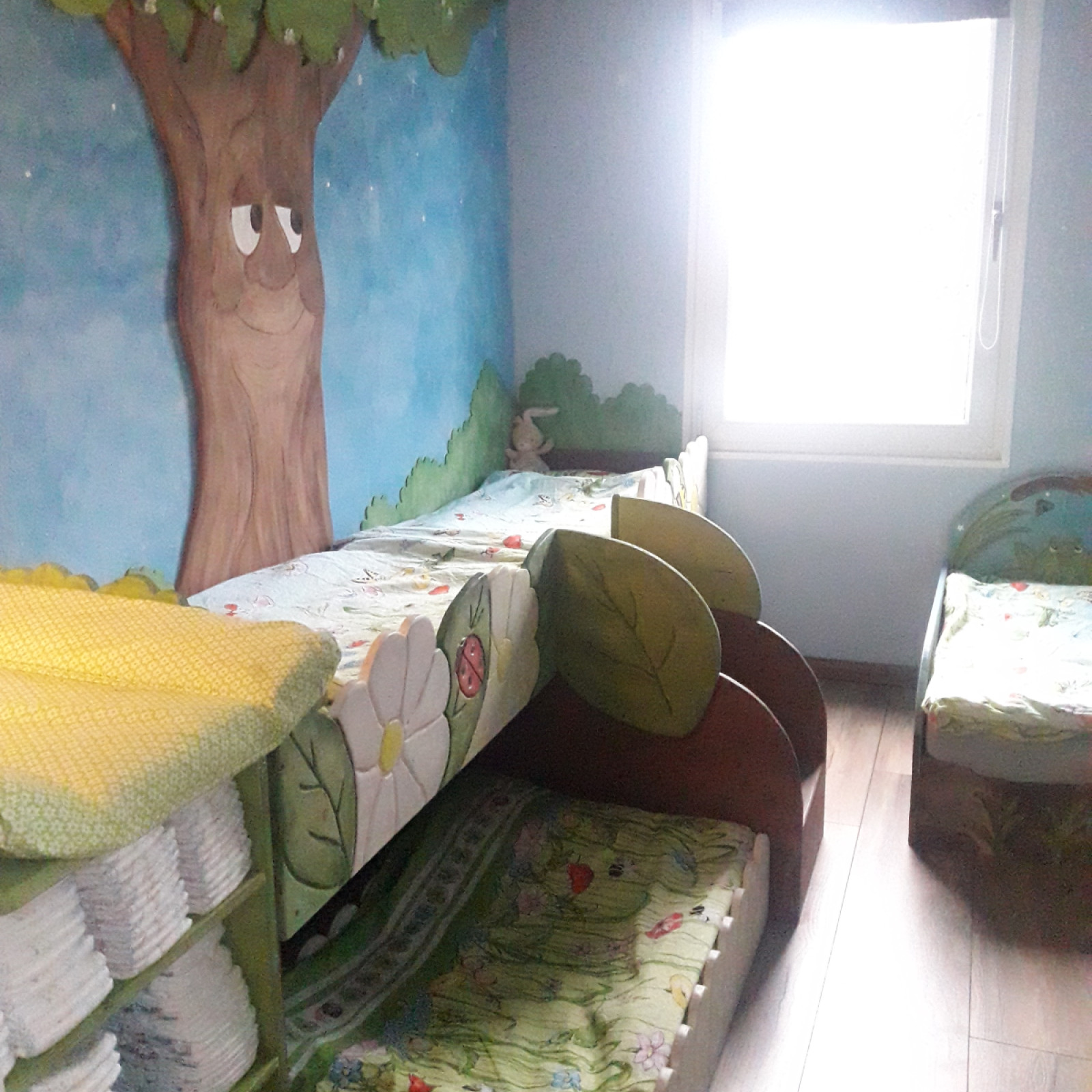 Der angrenzende Wald-Schlafraum mit fünf kleinen Holzbettchen schafft eine ruhige und geborgene Atmosphäre für die Mittagsruhe. Der Wickel,- und Pflegebereich befindet sich auch in diesem Raum.